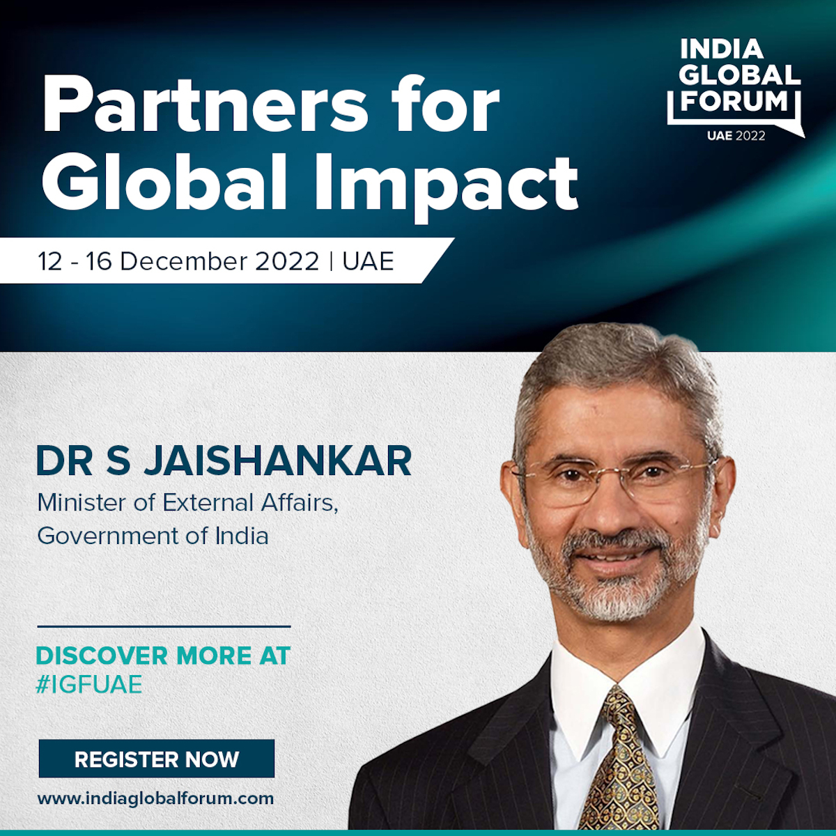 New Delhi, India/Dubai, UAE, December 8, 2022 — India Global Forum (IGF) today announced that the India Global Forum UAE 2022 – Partners for Global Impact to be held in the UAE from December 12 – 16, 2022 will be inaugurated by India’s External Affairs Minister, Dr S Jaishankar. The week-long high profile gathering will bring together leading political, business, and cultural figures from India, UAE and across the world.